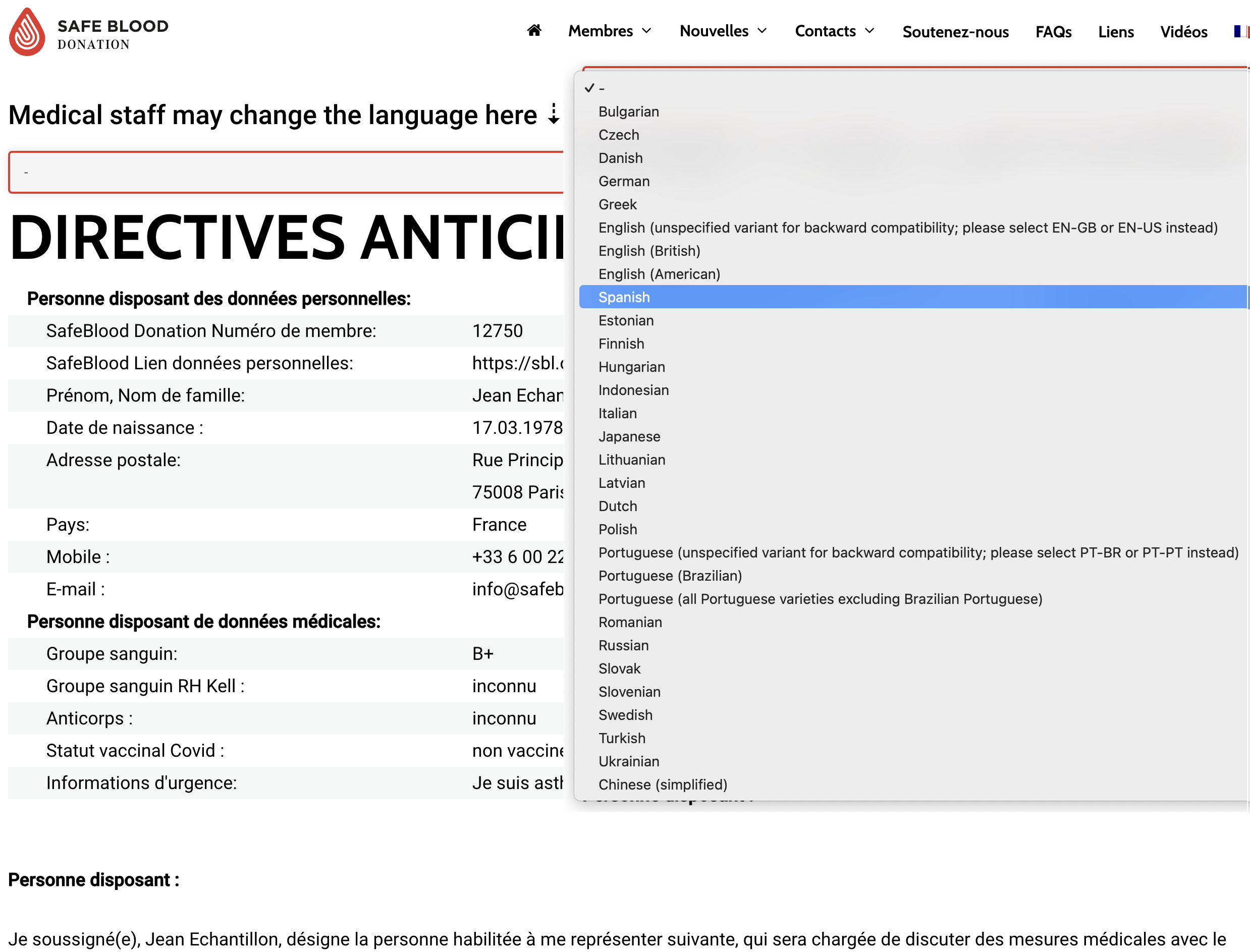 Il s’agit d’un échantillon des informations d’urgence (image de gauche) que le personnel médical d’urgence verra lorsqu’il scannera le code QR sur votre carte d’identité de membre ou accèdera au lien associé. Le personnel médical verra toutes les informations médicales pertinentes et votre testament de vie. (Vous pouvez voir l’intégralité du testament de vie sous “Exemple de testament de vie“).
