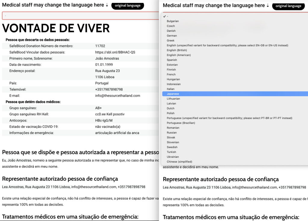 Uma vantagem importante aqui é que o pessoal médico assistente pode traduzir esta informação de emergência diretamente no website para todas as línguas comuns do mundo numa questão de segundos (imagem à direita). Isto assegura-lhe que será tratado adequadamente em todo o mundo.